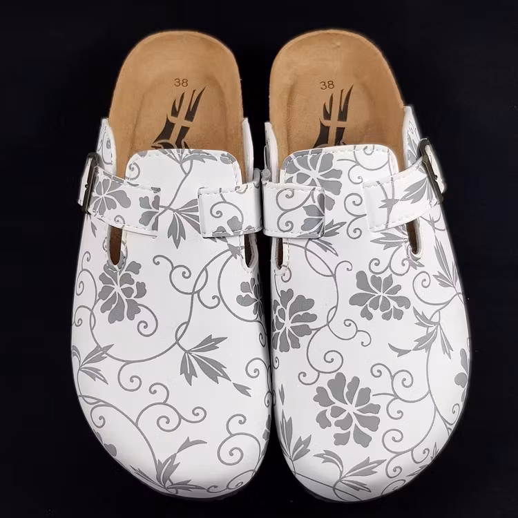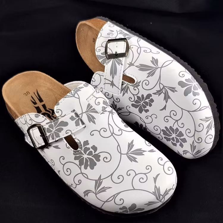 En bekväm sandal med svart sula av konstmaterial. En anatomiskt utformad fortbädd med överdel av konstläder.